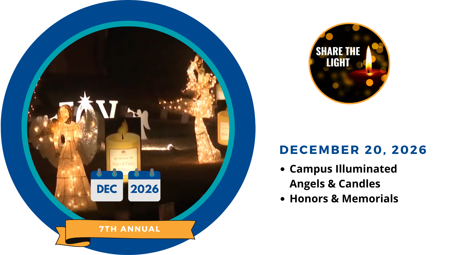 Share the Light takes place at Holy Angels for its 7th year on December 20, 2026. Visitors drive through our campus to experience illuminated candles, angels and a live nativity scene featuring our residents.